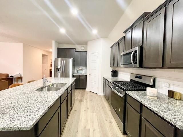 Gorgeous single-level residence at 520 Winthrop Rd built in 2024 & move-in ready! This luminous, open-concept home boasts 4 bedrooms, 2 baths, and an attached 2-car garage. The bright open kitchen includes stainless appliances, a gas range, generous countertops and a central island ideal for entertaining with recessed lighting throughout. The primary suite features a split-bedroom design and a roomy walk-in closet for added privacy. The private backyard is fully fenced, with an sprinkler system, covered patio and a lush lawn for recreation. All appliances, including washer and dryer, remain; a 75 inch TV, large sofa and king bed set are available to stay as well. Located in desirable Williamsburg with easy access to I-30 and community amenities: clubhouse with fitness center, pool and splash park, walking trails, playgrounds, open greens and a landscaped park with fishing pond. Schedule a showing today! Buyer to verify all info, measurements and room count.