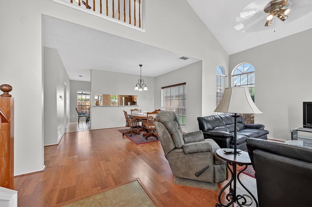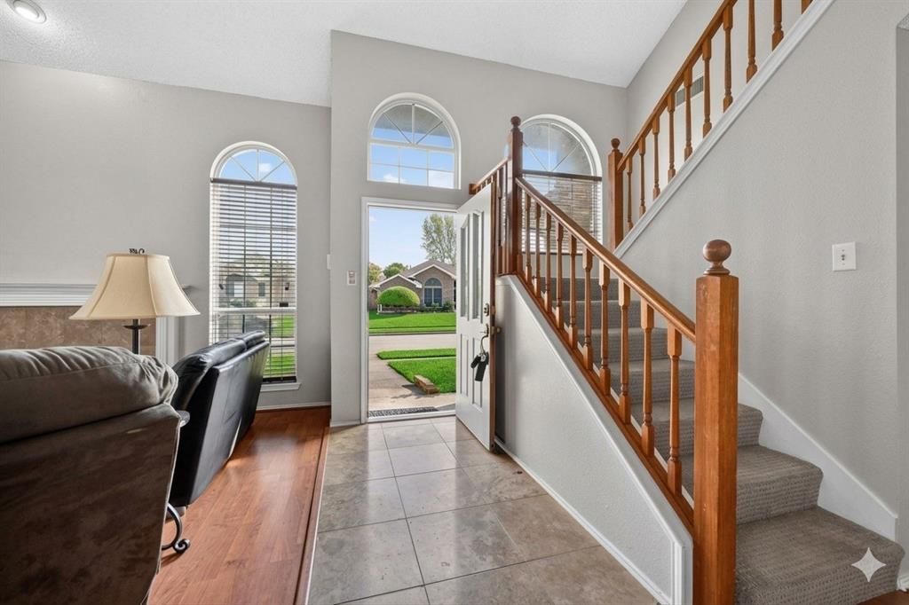 Don't wait any longer fresh new designer wall paint in the works come take a look & updated master bath! This beautiful two-story home offers an impressive entrance with vaulted ceilings, leading into an open-concept family room and dining area bathed in natural light plus a powder bath for the guest. The updated kitchen features granite countertops, ample counter space, and a breakfast area, perfect for casual meals. Enjoy your mornings or evenings on the covered patio overlooking the backyard, ideal for relaxing with a cup of coffee. The master suite is conveniently located downstairs, offering a private retreat with a separate tub and shower and a double vanity. Upstairs, a spacious game room provides a fantastic secondary living area for kids and their friends to gather. Both secondary bedrooms upstairs boast generous walk-in closets.. This home's location is a key highlight, being within walking or biking distance to the 117-acre Lakes of Springfield Park. The park features walking or biking trails, picnic pavilions, a playground, restrooms, and other amenities for outdoor enjoyment. Reviews from Yelp and Wheree describe the park as family-friendly with a large shaded playground, pond, and walking trails. The property is also conveniently located near Lake Ray Hubbard, major highways, Fire wheel Mall, and various restaurants, making it a truly desirable place to call home.