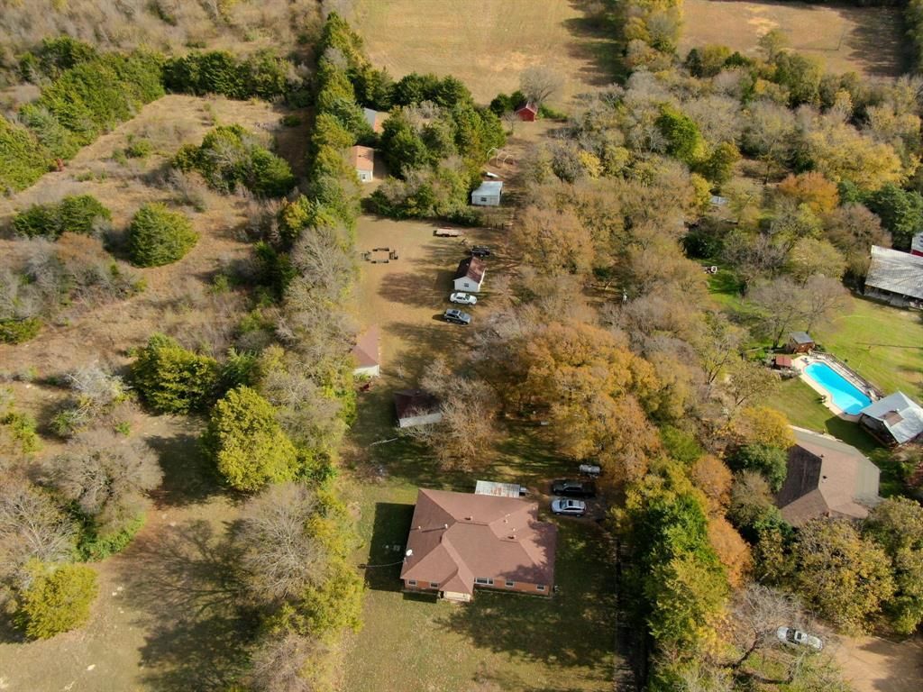 9.3 acre property. The feeling of country within the city limits. No restrictions as owners had a horse previously, and other animals are in the neighborhood. Backs up to Ten Mile Creek, where the flood plain exists, only at the rear of the property. Split bedrooms. Three bedroom and three baths. One newly renovated bathroom in the hallway between the two secondary bedrooms. Another bathroom off the living room has new floors and other updates going on at this time. The third bathroom that serves the primary is also being updated with tiles and new vanity. Outbuildings include one small barn, and a larger one used as storage for tractor. It is 20X30. Five additional, four with electricity. First, was to be used as a guest house, but not completed. Workshop with electricity. 2 offices, one with a window unit, and the other with an AC-Heat split. Conveniently located near I-35E. A well is on the property at the rear, but not used by the sellers. Much of the property is is fenced with chain link, barbed wire, and a cross fence. No survey is available. There is development in the area, but this is an area unto itself.